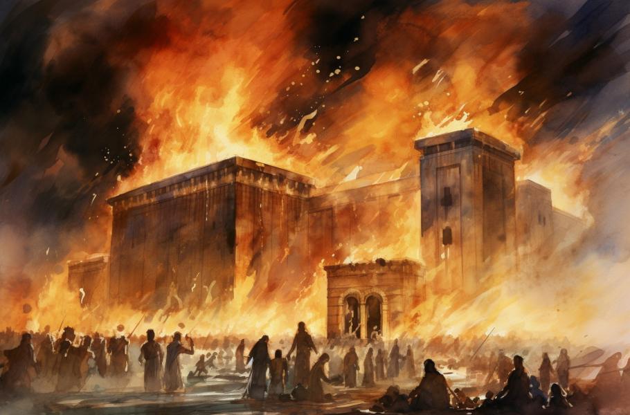 Zničení Šalomounova chrámu Babyloňany v roce 587/586 př. n. l. je významnou událostí ve starověkých dějinách Židů i v judaismu. (ilustrace: Midjourney AI, CC0)