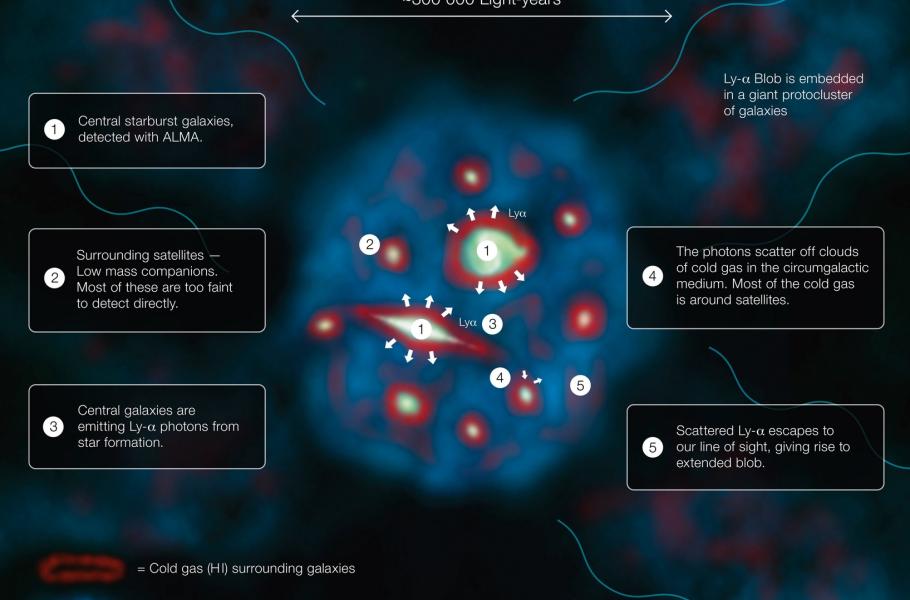 Až dosud výzkumníci nechápali, co nutí obří oblaky plynu označované jako Lyman-alpha Blob tak intenzivně zářit. Pomocí radioteleskopu ALMA se však nyní podařilo v srdci jednoho takového objektu nalézt dvojici galaxií, ve kterých překotnou rychlostí probíhá formování nových hvězd. A právě tento proces je zodpovědný za intenzivní vyzařování plynu v celém okolí.