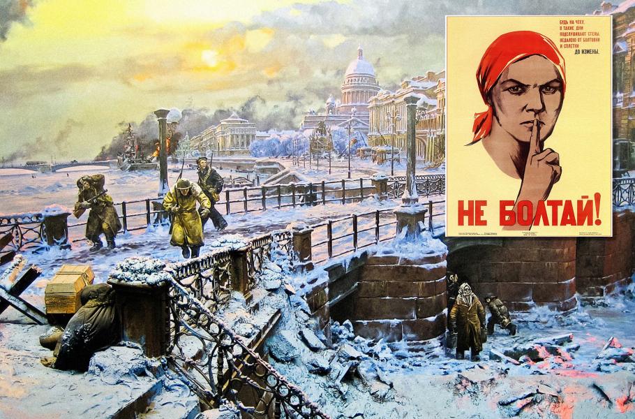Výjev z obležení Leningradu. Utrpení jeho obyvatel bylo nezměrné. Ve výřezu dobový plakát: „Nežvaň! Buď ostražitý, za takových dnů i stěny mají uši. Od zbytečných řečí je jen krok ke zradě.“