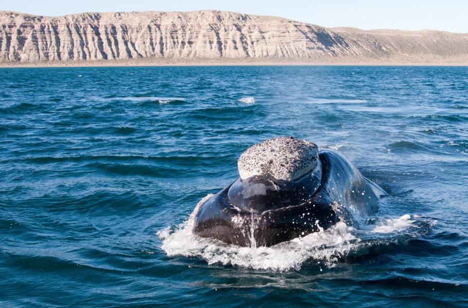 Obrovské velryby jižní se živí drobnými korýši a larvami, které filtruje přes kostice. Většinou se při hledání potravy potápí jen do hloubky 10–20 metrů a často jsou tak k vidění na mořské hladině. (foto: Shutterstock)