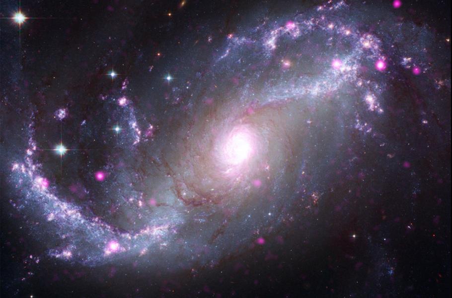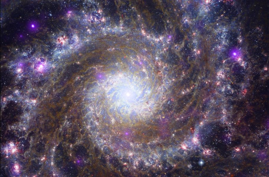 Data observatoře Chandra odhalují kompaktní objekty, jako jsou neutronové hvězdy nebo černé díry, táhnoucí hvězdný materiál a zbytky po explozích hvězd. Prach a plyn vyplňující spirální ramena pochází z dat Hubbleova teleskopu, zatímco data z Webbova dalekohledu odhalují prach a plyn ve spirálních ramenech galaxie. (foto: NASA, ESA, ESO, CC BY 4.0)