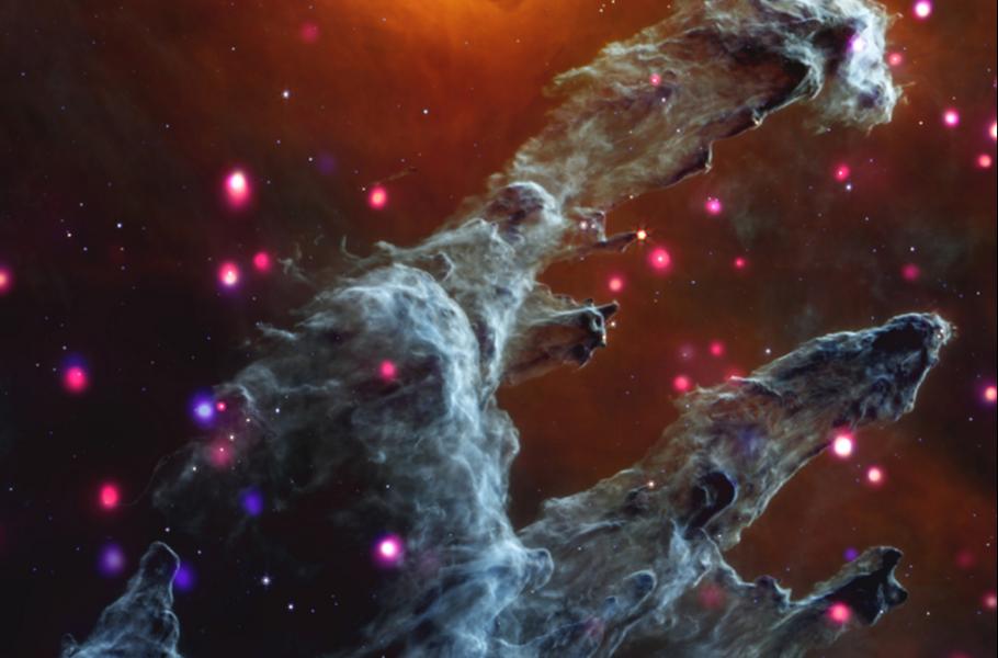 Data z teleskopu Jamese Webba ukazují oblaky a oblouky plynu a prachu, které hvězdy a planety používají jako zdrojový materiál při svém formování. Fialový mrak nalevo pochází z dat observatoře Chandra a jde o pozůstatek po výbuchu supernovy. (foto: NASA, ESA, ESO, CC BY 4.0)