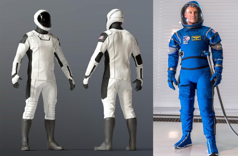 Nároky Elona Muska na estetickou stránku skafandru měly stejnou váhu jako požadavky na jeho funkčnost a spolehlivost. Skafandr pro Starliner (vpravo) postrádá skutečnou přilbu. Jde spíš o kapuci s pevným průzorem.