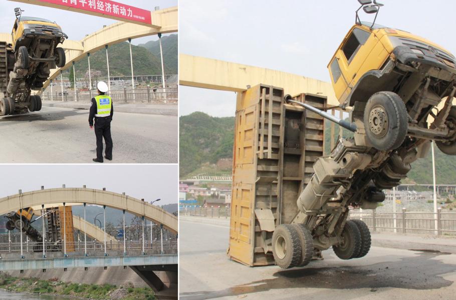 „Tak jsem slyšel, Karle, že jsi tomu Pražákovi načechral pilíř…“ Legendární hláška z filmové komedie dokonale pasuje i k fotografii pořízené minulý týden v Číně. Podle serveru watch-cn.com ale zřejmě za bizarní nehodou nestála nepozornost závozníka. Řidič po složení nákladu písku jednoduše zapomněl sklopit korbu svého náklaďáku a neštěstí bylo na světě. Samotný řidič vyvázl z nehody jen s lehčími poraněními a vážnější škody podle čínských médií neutrpěla ani nabouraná mostní konstrukce.