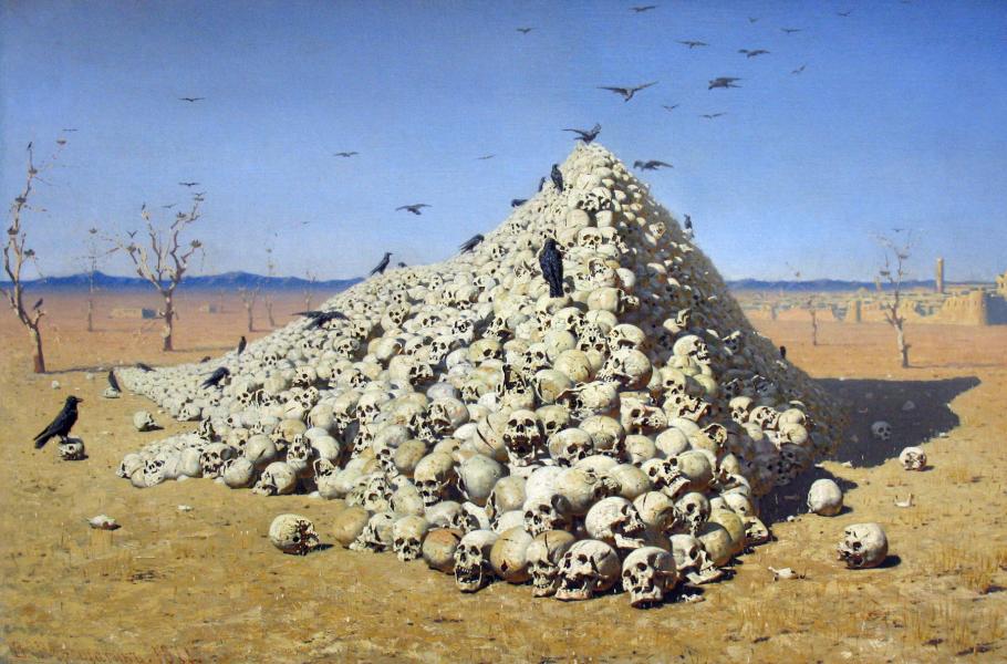 Žádná z Tamerlánových věží se nedochovala. Hromada lebek na obraze symbolicky znázorňuje válečné hrůzy, jak je podal malíř Vasilij Vereščagin roku 1871. (ilustrace: Wikimedia Commons, Vasily Vereshchagin, PDM 1.0)