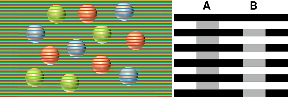 V jiné podobě demonstrují stejnou optickou iluzi obrazce s šedými obdélníky, které překrývá černobílá mřížka. Přestože jsou oba šedé obdélníky totožné, vlivem zkresleného vnímání se zdá, že obdélník v levé části je výrazně tmavší než ten vpravo.