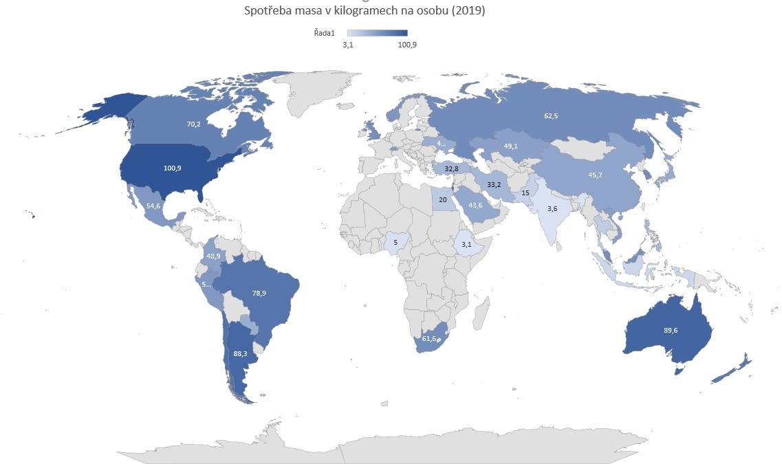 V naprosté většině světa tak obliba masa od roku 2000 neustále roste: Podle závěrů studie ho každý obyvatel planety v roce 2019 spořádal o 4,9 kilogramu víc než před dvaceti lety. V některých státech – například v Peru, v Rusku či Malajsii – se jeho konzumace za uvedený časový úsek dokonce zdvojnásobila. Na jednoho člověka v současnosti připadá 34 kilogramů masa za rok, z čehož necelou polovinu představuje drůbeží, následováno vepřovým a hovězím.