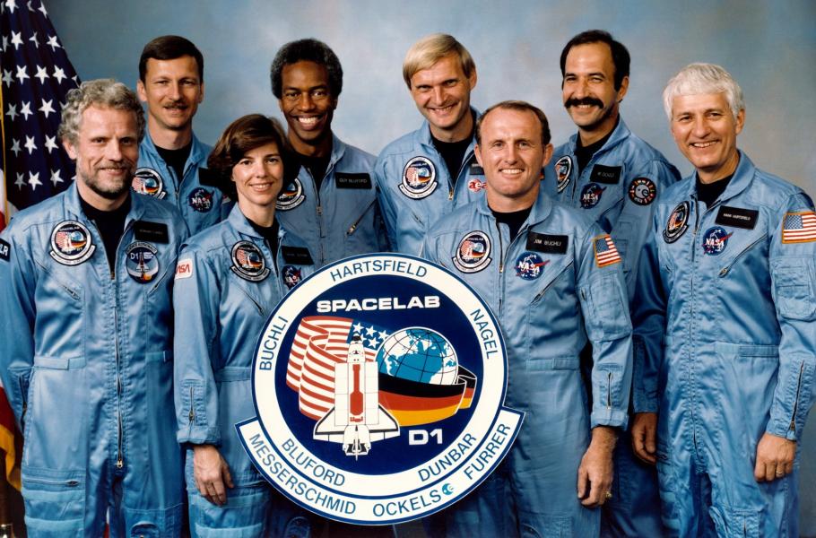 „Nejvytíženějším“ letem amerického raketoplánu se stala mise STS-61-A: V Challengeru odstartovali 30. října 1985 Američané Henry Hartsfield, Steven Nagel, James Buchli, Guion Bluford a Bonnie Dunbarová, dále Reinhard Furrer a Ernst Messerschmid z Německa a také Wubbo Ockels z Nizozemí coby zástupce ESA. Osmičlenná posádka mimo jiné uskutečnila 76 vědeckých experimentů na palubě laboratoře Spacelab D1 a pro obsluhu pokusů se při letu rozdělila na dvě směny. (foto: Wikimedia Commons, NASA, CC0)