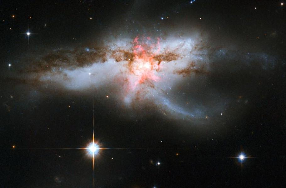 Ultrazářivá infračervená galaxie NGC 6240 se zrodila splynutím dvou aktivních galaxií