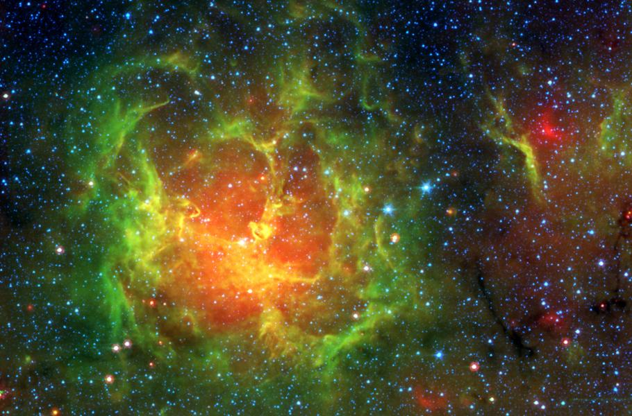 Mlhovinu Trifid, známou také jako M20, najdete snadno i malým dalekohledem. Měří asi 30 světelných let, dělí ji od nás 5 500 světelných roků a představuje oblíbený cíl kosmických turistů v souhvězdí Střelce. Jak naznačuje její jméno, ve viditelném světle ji rozdělují tmavé neprůhledné pásy prachu na tři části. Ovšem pronikavý infračervený snímek, pořízený Spitzerovým teleskopem, odhaluje filamenty zářících prachových mračen a nově vzniklých hvězd. Astronomové fotografii použili ke sčítání čerstvě zrozených a embryonických stálic, jež se jinak skrývají v oblacích zárodečného prachu a plynu této fascinující hvězdné porodnice. Spitzerův dalekohled byl vypuštěn v roce 2003, aby zkoumal infračervený vesmír. Na počátku loňského roku svou vědeckou činnost ukončil. (foto: NASA, JPL-Caltech, J. Rho, CC BY-SA 4.0)