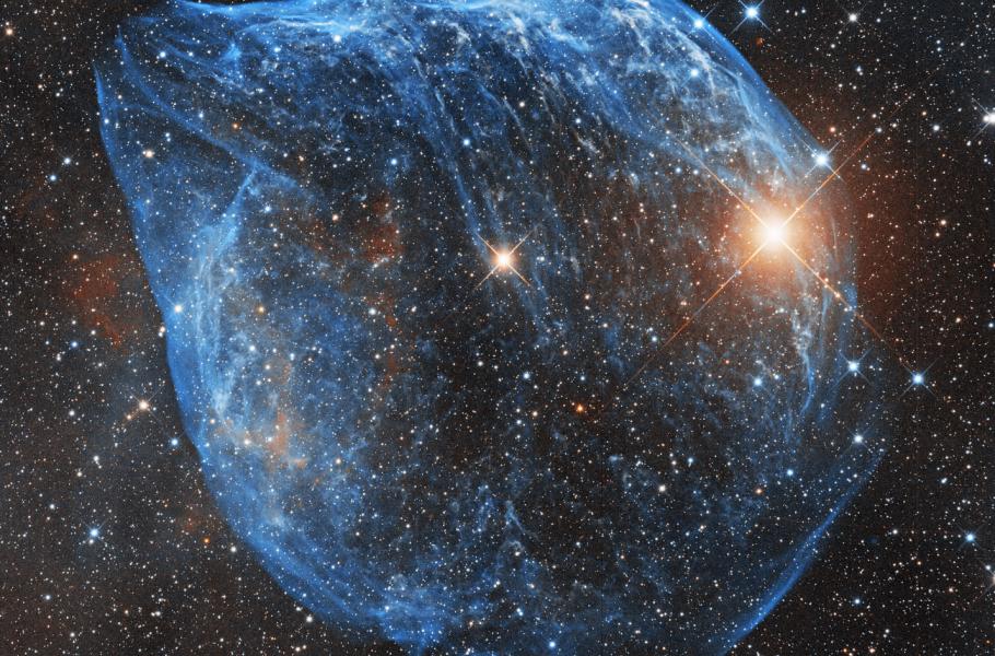 Kosmická bublina rozfoukaná větry z horké hmotné hvězdy, známá pod označením Sharpless 2-308 nebo také Delfín, se nachází zhruba 5 200 světelných let daleko v souhvězdí Velkého psa. Na obloze pokrývá oblast o něco větší než úplněk, což v odhadované vzdálenosti odpovídá průměru 60 světelných roků. Mlhovinu vytvořila Wolf-Rayetova hvězda, jasná a hmotná stálice viditelná v jejím středu. Zmíněné hvězdy dosahují víc než dvacetinásobku hmotnosti Slunce a považují se za krátkou fázi vývoje hmotných stálic před supernovou. Když se rychlé větry WR hvězdy potkaly s pomaleji se pohybujícím materiálem z předchozího stadia vývoje, zformovaly mlhovinu ve tvaru bubliny. Větrem nafouknutý Delfín se zrodil asi před 70 tisíci lety. (NASA, APOD, Anis Abdul, CC BY-SA 4.0)