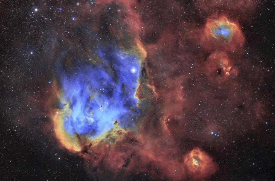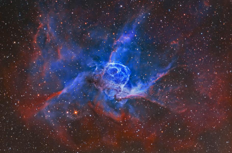 Thorova přilba, jak se populárně nazývá kosmické mračno NGC 2359, má hrdinské rozměry i na norského boha: Měří asi 30 světelných let. Spíš než o přilbu se však jedná o mezihvězdnou bublinu, rozfouknutou rychlým větrem z jasné hmotné stálice v centru. Tato Wolf-Rayetova hvězda představuje horkého obra v krátkém vývojovém stadiu před supernovou. NGC 2359 se nachází zhruba 15 tisíc světelných let daleko v souhvězdí Velkého psa. Pozoruhodně ostrý snímek tvoří směsici dat z široko- a úzkopásmových filtrů ze tří různých dalekohledů, přičemž zachycuje přirozeně vypadající stálice i podrobnosti filamentárních struktur mlhoviny. Převládající modrá pochází ze silné emise dvakrát ionizovaných atomů kyslíku v zářícím plynu. (foto: NASA, APOD, Martin Pugh, CC BY-SA 4.0)