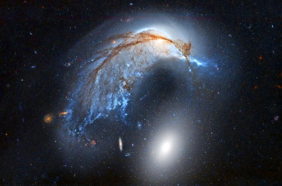 Ještě před pár stovkami milionů let představovala NGC 2936 běžnou spirální galaxii. Pak se však Sviňucha, jak se pro svůj ikonický tvar nazývá, dostala příliš blízko hmotné eliptické NGC 2937, která září ve spodní části snímku. Následkem těsné gravitační interakce je tak Sviňucha nejen vychýlená, ale také zborcená. Její „nos“ zformoval poryv mladých hvězd, střed spirály pak vypadá jako oko. Galaktický pár, dohromady označovaný Arp 142, někomu připomíná i tučňáka chránícího svá vejce. Systém se nachází asi 300 milionů světelných let daleko v souhvězdí Hydry a za několik miliard let hvězdné ostrovy nejspíš splynou v jednu velkou galaxii. (foto: NASA, ESA, and The Hubble Heritage Team (STSci/AURA), CC BY-SA 4.0)