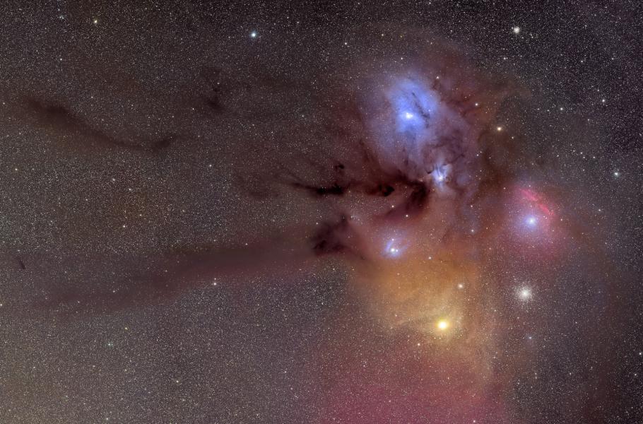 K barvitým mračnům u červeného obra Antares zvolna „přitéká“ Temná řeka. Jedná se o temnou mlhovinu zakrývající hvězdy poblíž centrální Mléčné dráhy. Prach rozptyluje světlo zmíněné stálice a vytváří neobvyklou žlutou reflexní mlhovinu. Jasná modrá dvojhvězda Rho Ophiuchi se noří do typičtějších modrých reflexních mlhovin, spolu s červenými emisními. Kulová hvězdokupa M4 vpravo od Antaresu leží daleko za barevnými mračny, asi sedm tisíc světelných let od Země, zatímco Temnou řeku od nás dělí zhruba 500 světelných roků. Barevný obraz tvoří mozaika teleskopických snímků, jež na nebi v souhvězdí Štíra pokrývají téměř 10°, tedy asi 20 měsíčních úplňků. (foto: NASA, APOD, Markus Noller, CC BY-SA 4.0)