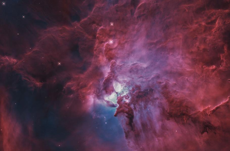 Střed mlhoviny Laguna víří překotným zrodem stálic. Extrémní hvězdné větry a intenzivní energetické světlo daly vzniknout přinejmenším dvěma trychtýřovitým mračnům, dlouhým asi půl světelného roku, viditelným uprostřed. Oblast osvětluje nesmírně jasná hvězda Herschel 36. Další horké mladé stálice jsou buď skryté, nebo zčervenalé stěnami prachu. Jejich energie proudí do chladného plynu a prachu, přičemž způsobuje velké teplotní rozdíly v přilehlých regionech, kde mohou nastávat střihové větry a formovat další trychtýře. Mlhovina Laguna neboli M8 se nachází zhruba pět tisíc světelných let daleko v souhvězdí Střelce. (foto: NASA, APOD, Michael Miller, Jimmy Walker, CC BY-SA 4.0)