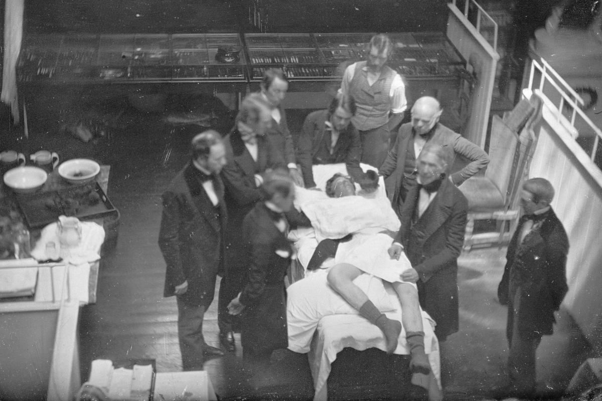 První veřejná operace pacienta uspaného éterem v říjnu 1846 v Massachusettské všeobecné nemocnici. Zákrok provedl vážený chirurg John Warren, jako anesteziolog mu asistoval William Morton. (foto: Wikimedia Commons, Southworth & Hawes, CC0)