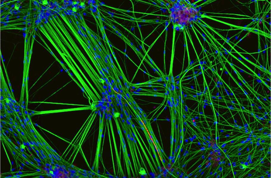 Z třetího místa se radovala Rebecca Nutbrownová díky snímku dvacetkrát zvětšených neuronů (obarveny zeleně) a tzv. Schwannových buněk (zvýrazněny červeně), jež pomáhají urychlovat přenos nervových signálů.
