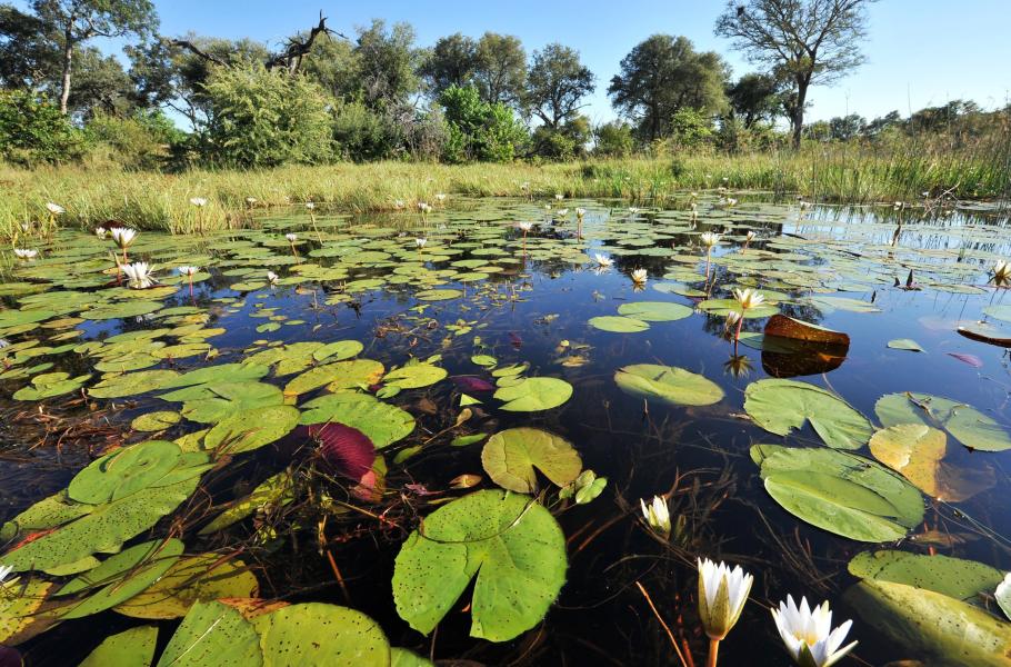 Na hladině vás při pohledu z přízemní perspektivy na první pohled zaujmou pokryvné, volně plovoucí rostliny. Okavango je totiž mimo jiné rájem leknínů. Rozkvetlé, rozsáhlé vodní plochy působí úchvatně. Zvlášť, když se po nich plavíme domorodou kánoí vytesanou z kmene stromu, kterou bidlem pohání obratný domorodec.