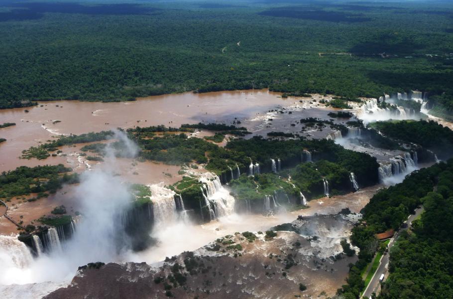 Vodopády Iguazú na argentinsko-brazilské hranici tvoří dohromady 275 kaskád v celkové šířce 2 700 metrů. Představují tak největší podobný vodní systém na světě