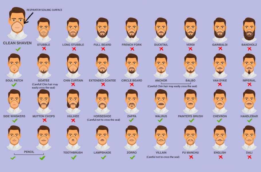 Grafika Centra pro kontrolu a prevenci nemocí (CDC) ukazuje, že některé sestřihy vousů mohou snižovat účinnost respirátorů při ochraně před nebezpečnými viry. Výraznější porost na tváři totiž brání těsnému dosednutí respirátoru na tvář. Grafika vznikla již v roce 2017 v souvislosti s tehdejší epidemií viru SARS, vzhledem k podobnosti aktuálně se šířícího viru SARS-CoV-2, je ale platná i dnes.