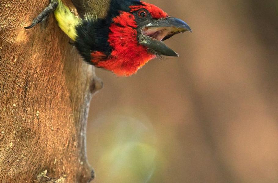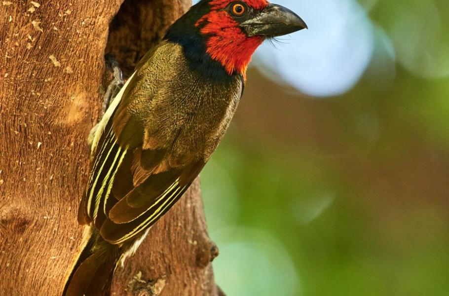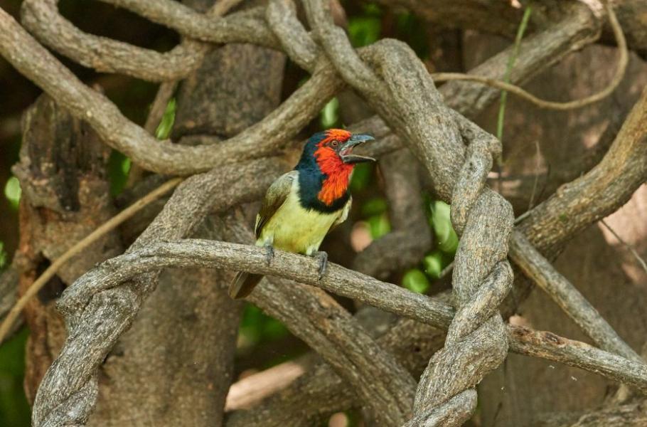 Nacházíme se na jižním okraji delty řeky Okavango, v severní Botswaně. Podané informace o tom, jak se nápadný pták projevuje a kde tak činí, jistě nejsou vyčerpávající; zkušenému ptáčkaři či fotografovi afrického opeřenstva přesto poskytují solidní vodítko. Celkem evidentně jde o nějakého zástupce čeledi afrických vousáků, v tomto případě o vousáka obojkového (Lybius torquatus).