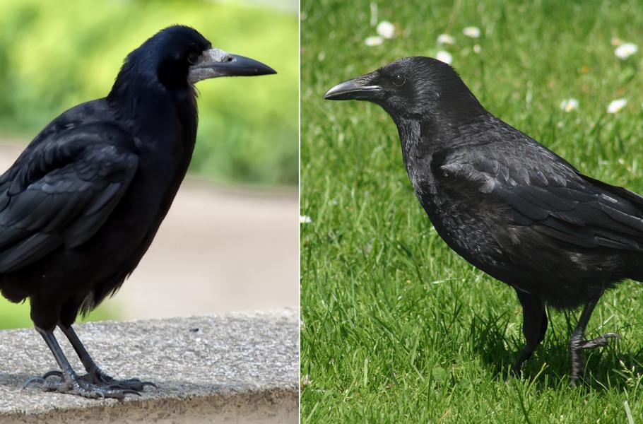 Vrána, nebo havran? Zatímco vráně se peří na slunci leskne zelenkavě a její zobák má barvu černou, havraní peří je namodralé a zobák šedý, u dospělých jedinců s výraznou lysinou u kořene.