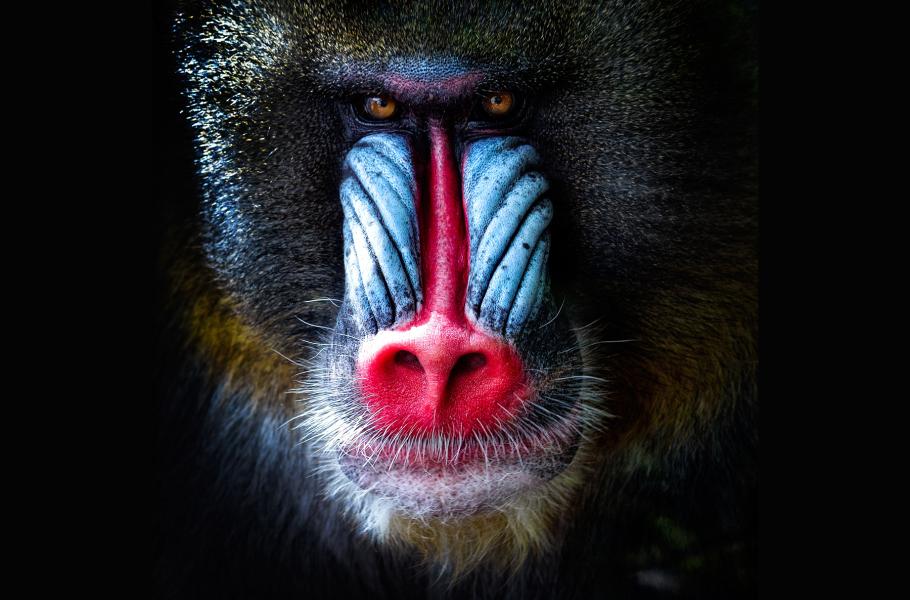 Na těle dospělých samců mandrila rýholícího jsou zdaleka nejnápadnější pestře vybarvené líce. Nezvyklé odstíny však kryjí i jejich genitálie a řitní otvor, kde se mísí červená s růžovou, modrou či fialovou. Dominantní vůdci smeček mají navíc výraznější zbarvení než podřízení samci. (foto: Shutterstock)