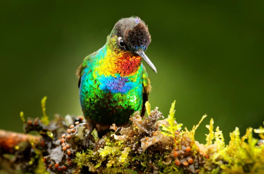 Přirozené prostředí tohoto drobného, pouhých 5,7 gramu vážícího ptáčka představují koruny stromů v nadmořské výši okolo 1 400 metrů, kde se živí nektarem či drobným hmyzem. Větve a stromoví si kolibříci dělí na teritoria, která pak ze všech sil brání – a ti ohnivobradí jsou nejsrdnatější. (foto: Shutterstock)