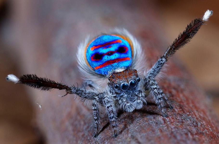 Pavouci Maratus volans z čeledi skákavkovitých dorůstají délky pouhých pěti milimetrů. Na první pohled však zaujmou především „klopou“ hýřící barvami, kterou mají samečci na zadečku a využívají ji k přilákání družky. V angličtině si díky ní vysloužili pojmenování „peacock spiders“, tedy „paví pavouci“. (foto: Shutterstock)