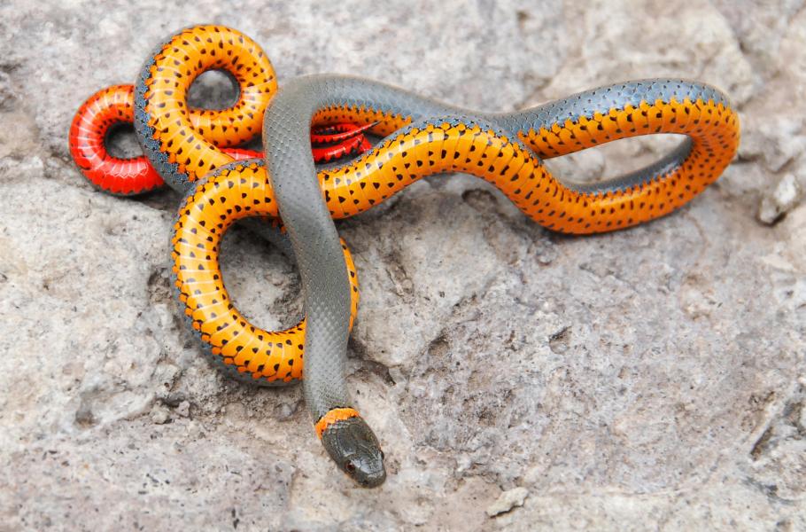 Domovem užovky tečkované královské se staly kamenité pouště a hory, kde splývá s terénem díky šedému povrchu těla. Na její přítomnost běžně upozorňuje pouze tenký žlutý či oranžový prstenec u hlavy. Pestrobarevné „břicho“ had odhaluje, jen pokud se cítí ohrožený a chce nepřítele zastrašit. (foto: Shutterstock)