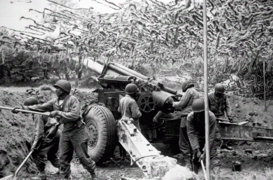 Americká 155mm houfnice M114 ve Francii. Pozorovatelé US Army dokázali díky rádiu koordinovat palbu dělostřelectva na desítky kilometrů. (foto: Wikimedia Commons, CC0)