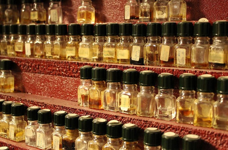 V muzeu vůní v Kolíně nad Rýnem jsou k vidění flakony staré téměř 200 let. Ve výřezu voňavkář Johann Maria Farina.