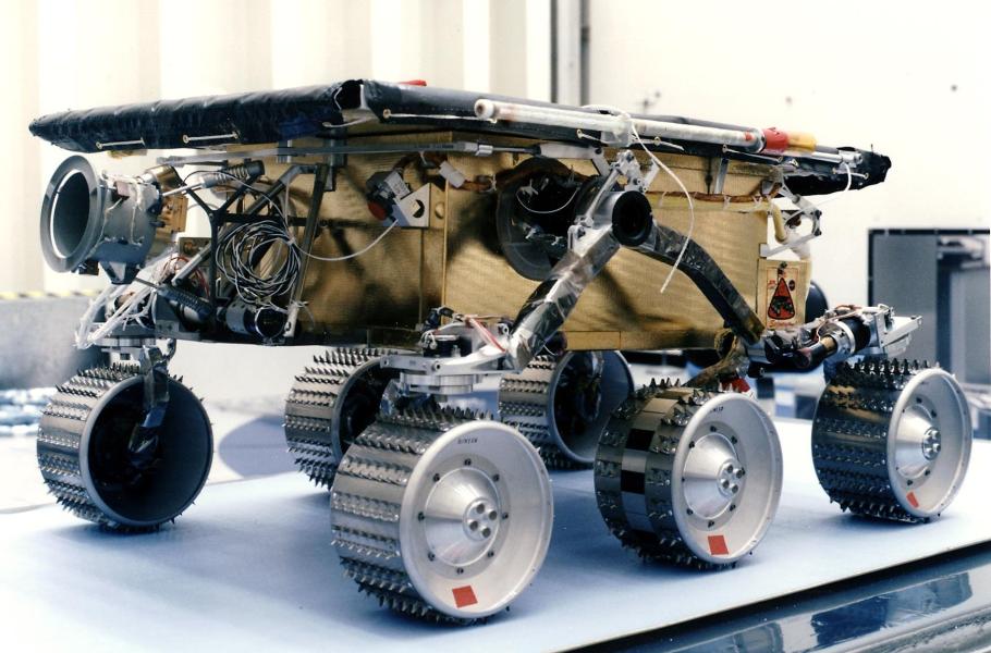 První americký pojízdný robot dostal jméno Sojourner a vydal se na rudou planetu. Cestoval k ní na palubě sondy Pathfinder, jež odstartovala 4. prosince 1996. Po přistání 4. července 1997 v oblasti Ares Vallis sjel rover na povrch a zahájil vědecký výzkum, zahrnující především snímkování a rozbor hornin. Robot se pohyboval na šesti kolech a jeho hmotnost činila 10,6 kg při rozměrech 65 × 48 × 28 cm. Elektrickou energii mu dodávaly solární články pokrývající jeho horní část. Vozítko i přistávací modul Pathfinder fungovaly na Marsu tři měsíce. Sojourner poslal k Zemi 550 snímků a provedl 16 chemických analýz. (foto: Wikimedia Commons, NASA, CC0)