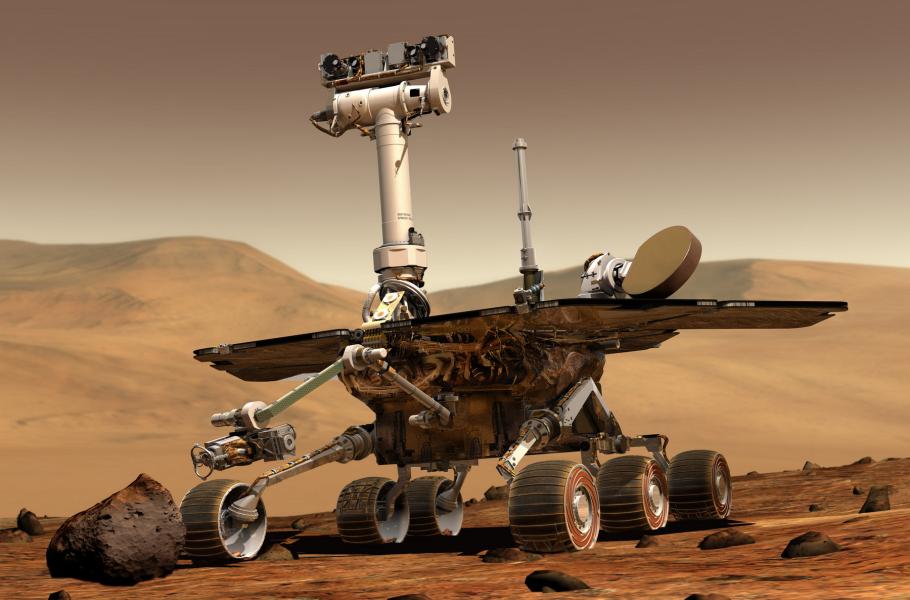 Zřejmě nejznámějšími robotickými průzkumníky cizí planety se staly rovery Spirit a Opportunity. První zmíněný odstartoval 10. června 2003 a na Mars dorazil 4. ledna následujícího roku. O necelý měsíc později jej následoval Opportunity, se startem 7. července 2003 a přistáním 25. ledna 2004. Životnost zařízení se plánovala na 90 dnů, ale obě ji značně překročila. Se Spiritem se naposledy podařilo navázat spojení 22. března 2010, zatímco s jeho dvojčetem se kontakt přerušil až 10. června 2018, s nástupem globální prachové bouře. Během čtrnáctileté mise překonal Opportunity vzdálenost více než 45 km a k Zemi odeslal 225 tisíc snímků. (ilustrace: NASA/JPL, CC0)