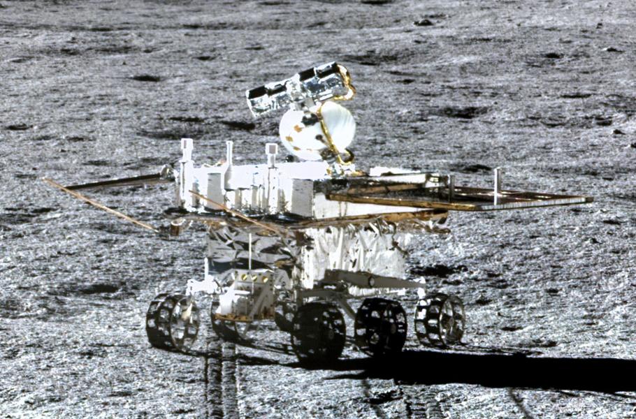 Ambiciózní program čínského výzkumu Měsíce zahrnoval mimo jiné vyslání dvou vědeckých pojízdných laboratoří. První z nich, nazvanou Yutu neboli „nefritový králík“, dopravila na zemského souputníka sonda Chang’e 3 v prosinci 2013. Rover bohužel zůstal záhy po přistání nepohyblivý, ale jeho přístroje fungovaly dlouhodobě. Následovníka Yutu 2 (na snímku) vynesla sonda Chang’e 4 a přistál 3. ledna 2019 na odvrácené straně, v kráteru Von Kármán. Dosud je aktivní a překonal již vzdálenost zhruba 1 000 m. Data se na Zemi přenášejí přes retranslační družici Queqiao, kroužící kolem libračního bodu L2 soustavy Země–Měsíc. (foto: Wikimedia Commons, CSNA/Siyu Zhang/Kevin M. Gill, CC BY 2.0)