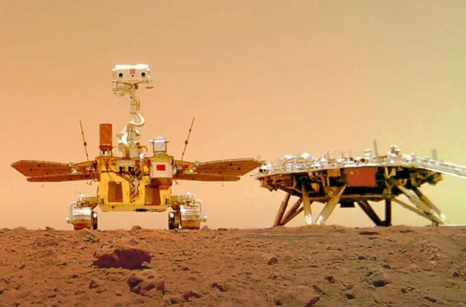 Třiadvacátého července 2020 se k rudé planetě vydala také Čína. Její první sonda určená k průzkumu Marsu, Tianwen-1, sestávala ze tří částí: orbiteru, landeru a roveru Zhurong k detailnímu studiu marsovského povrchu. Pojízdná laboratoř nese na palubě šest vědeckých přístrojů: radar GPR pro zkoumání podpovrchových vrstev do hloubky 100 m, detektor povrchového magnetického pole MSMFD, meteorologickou stanici MMMI, detektor složení povrchových vrstev MSCD a dvojici kamer – multispektrální MSC i navigační a topografickou NTC. Přiložený snímek roveru pořídila „odhozená“ kamera. (foto: Wikimedia Commons, China News Service, CC BY 3.0)