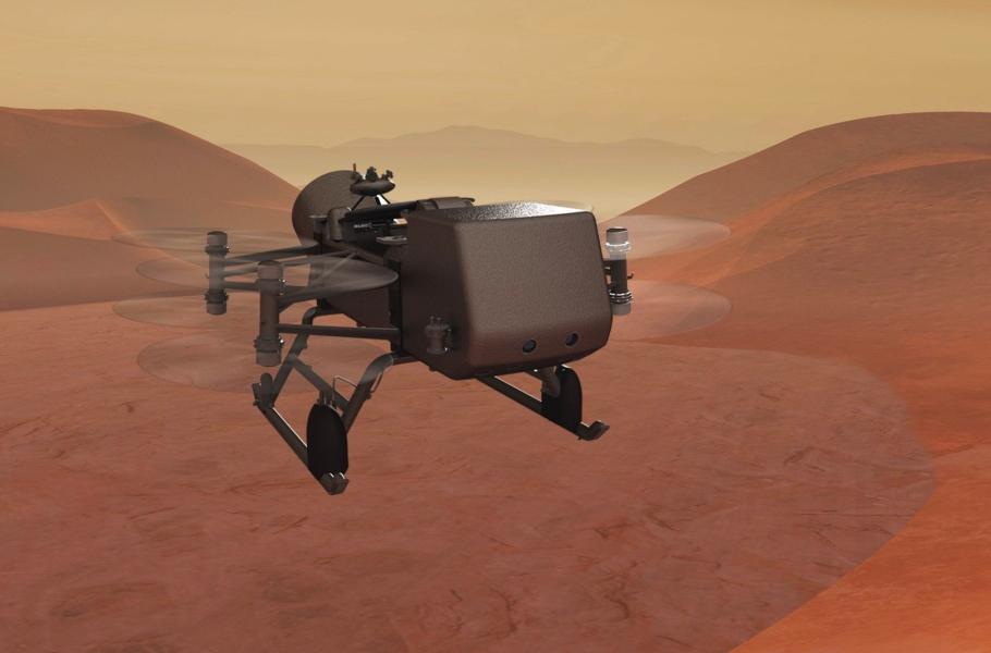 Start dalšího „pohyblivého“ zařízení se plánuje na rok 2027 a cílem se stane Saturnův největší měsíc Titan. Průzkumník nazvaný Dragonfly neboli „vážka“ však nevyužívá kola: Jedná se o tzv. kvadrokoptéru, jež bude přelétávat z místa na místo a studovat různé oblasti na povrchu i pod ním. Zaměří se rovněž na hustou atmosféru souputníka, kterou společně s nízkou gravitací využije pro svůj let. Dokáže tak prozkoumat desítky míst napříč Titanem, odebírat vzorky, měřit složení organického materiálu kvůli určení obyvatelnosti prostředí a studovat prebiotickou chemii. (ilustrace: NASA/JHU-APL, CC0)