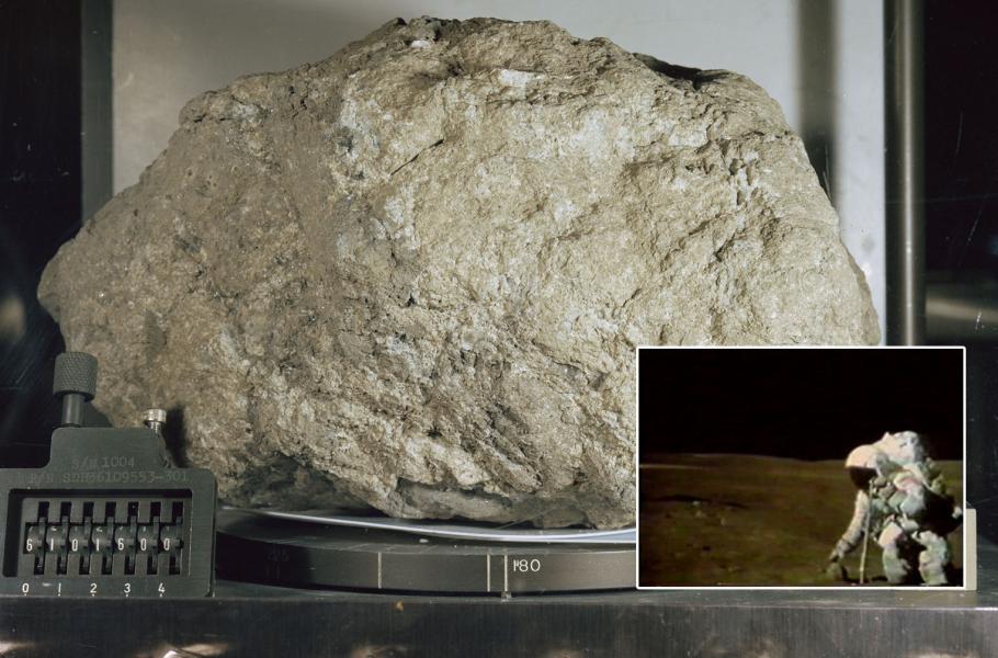Kámen na snímku je tzv. Big Muley – s téměř 12 kilogramy největší měsíční kámen, který byl v rámci projektu Apollo dopraven na Zemi. Své jméno získal po Billu Muehlbergerovi, vedoucímu týmu geologů mise Apolla 16. Kámen byl objeven na východním okraji kráteru Plum, v oblasti Descartes Highlands. V současné době je kámen vystaven v Johnsonově vesmírném středisku v Houstonu. Na vloženém snímku je Charlie Duke, americký astronaut sbírající Big Muley.