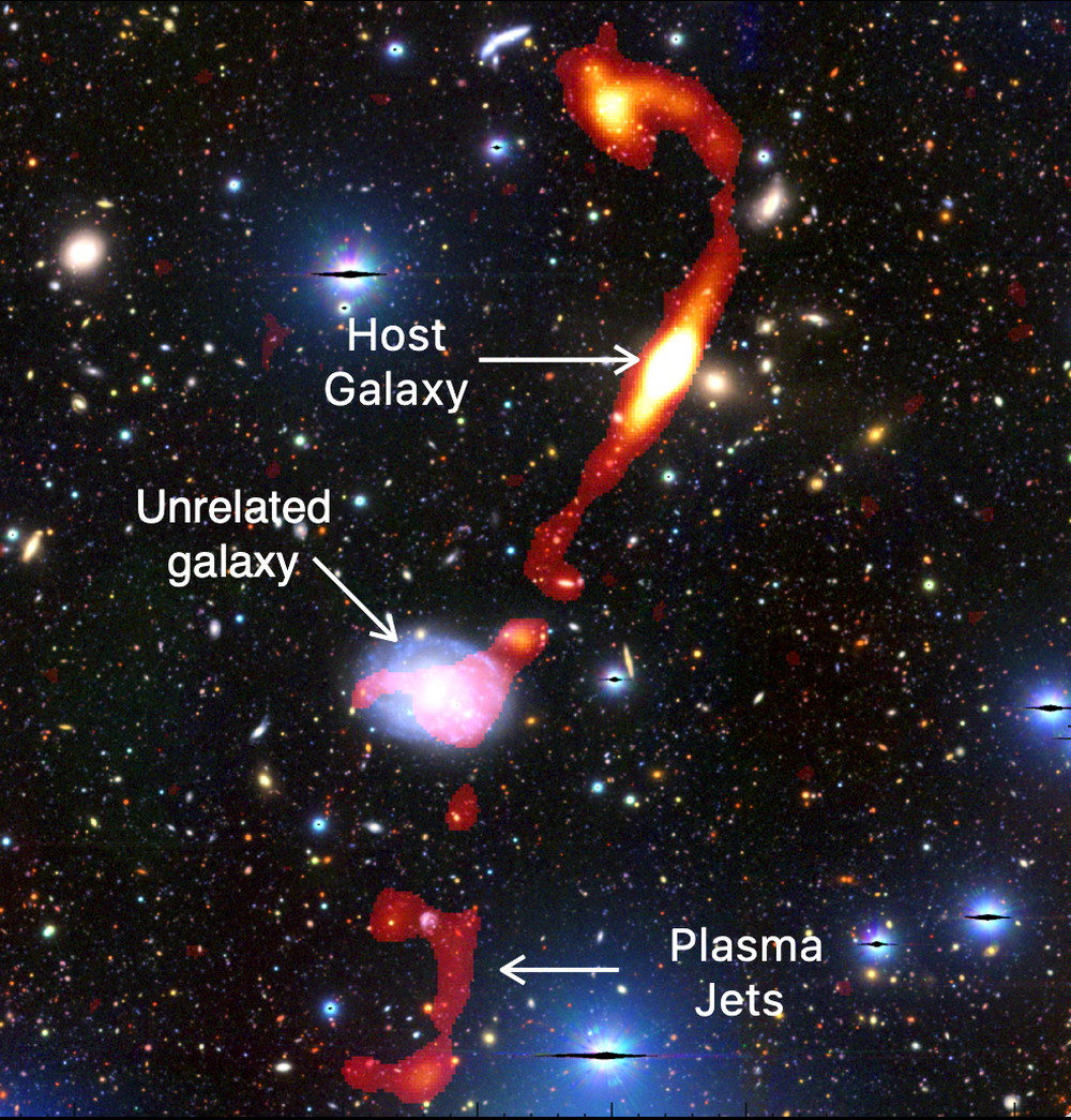 Jihoafrická soustava radioteleskopů MeerKAT si připsala objev pozoruhodné obří rádiové galaxie, která chrlí z oblasti své centrální supermasivní černé díry výtrysky plazmatu do vzdálenosti více než tří milionů světelných let.
