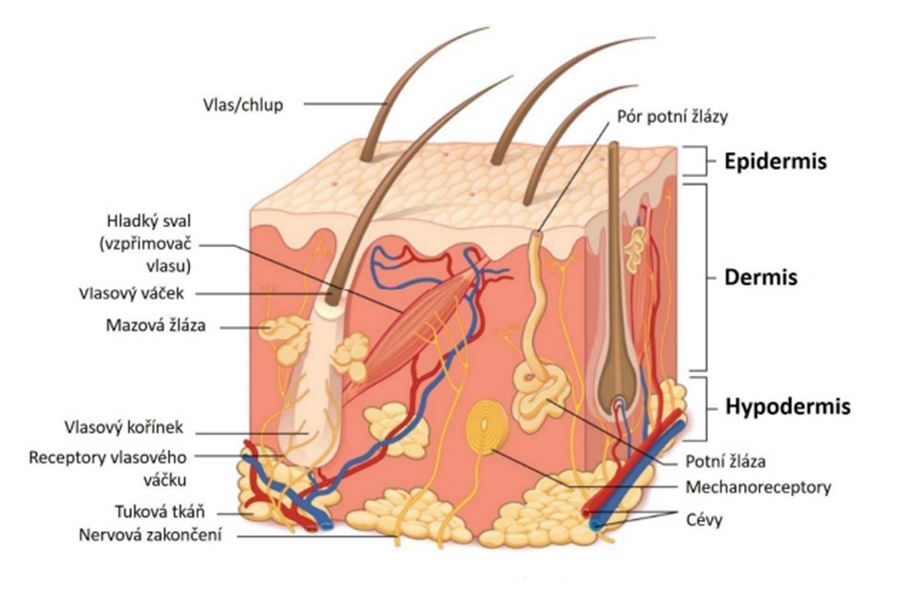 Vrstvy lidské kůže (ilustrace: Univerzita Karlova Farmaceutická fakulta v Hradci Králové, CC0)