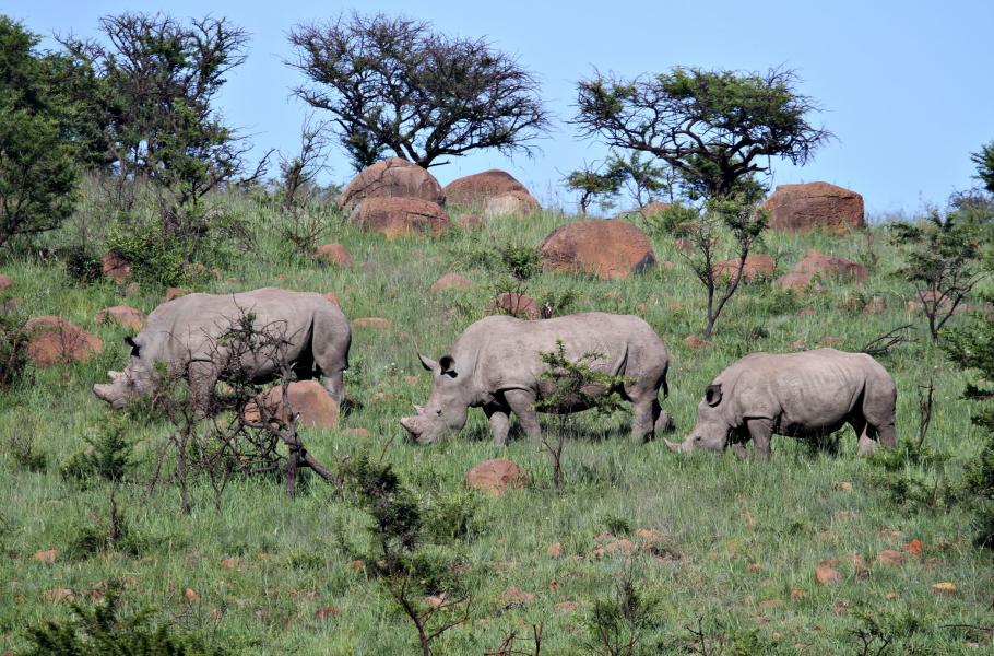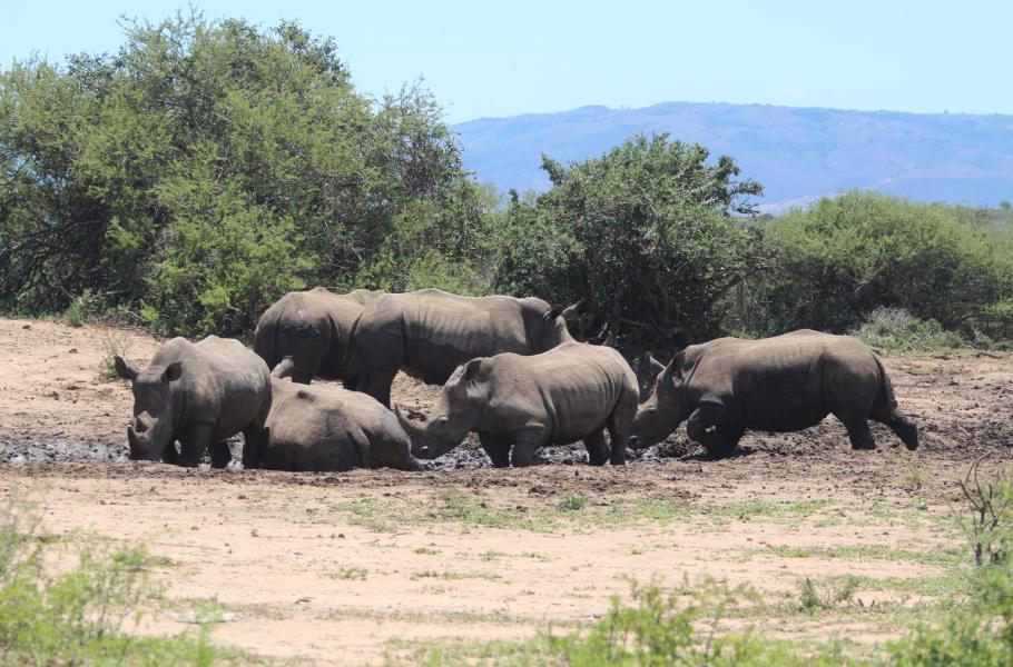 Narazit tady na bílé nosorožce, které studuje právě Marneweck, není vůbec vzácné. V parku jich podle odhadů žije přes 1 500. Když je velké sucho, potkáte nezřídka i osmi- nebo vícečlenné skupinky u bahnišť, jak pokojně odpočívají ve stínu akácií a křovisek. Nechybí ani partičky dorůstajících puberťáků, kteří jsou už příliš velcí na to, aby se drželi matky, ale osamělý život je zatím neláká. Při větší dávce štěstí narazíte i na vzácnější a plašší nosorožce dvourohé (Diceros bicornis). Zkrátka na první pohled ráj nosorožců.