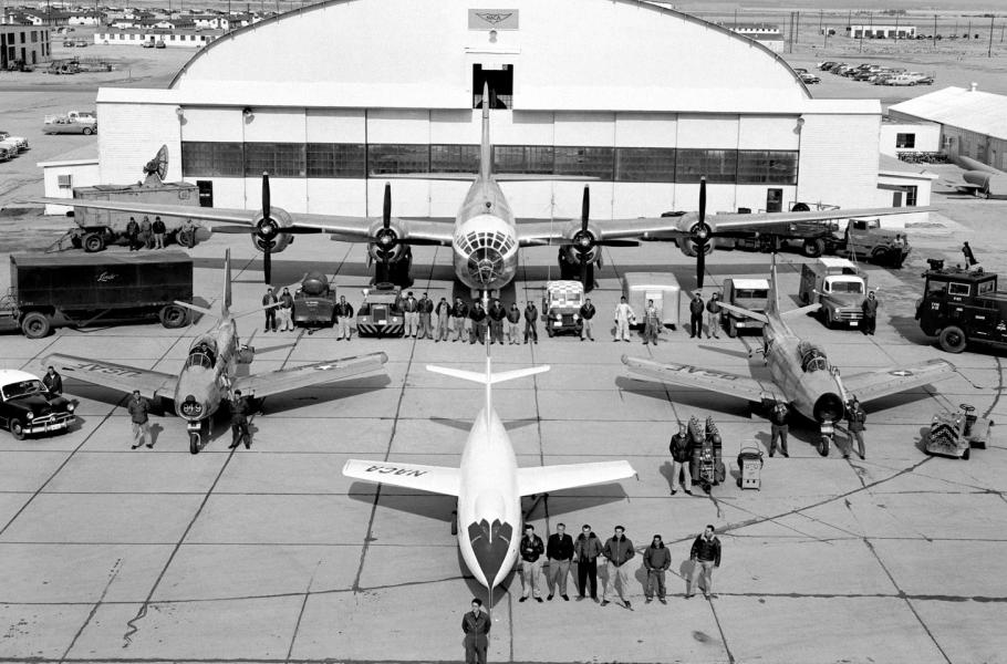 Střecha budovy Flight Research Building s nápisem odrážejícím přerod NACA v NASA, říjen 1958. (foto: NASA, CC0)