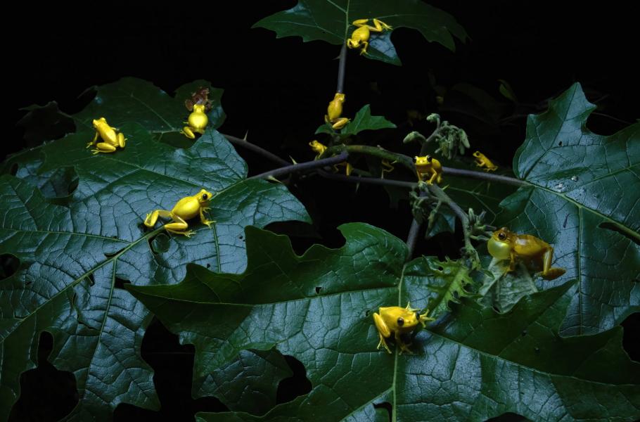 Francouzský fotograf se za deště vydal do nitra jihoamerického pralesa, následoval tekoucí vodu, a nakonec dorazil k dočasnému jezírku. Tam se mu pak podařilo zachytit skupinu rosniček malých při prchavém aktu páření. (foto: WPotY, Quentin Martinez - se souhlasem k publikování)