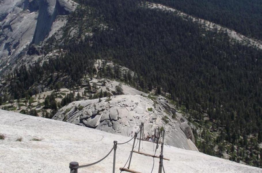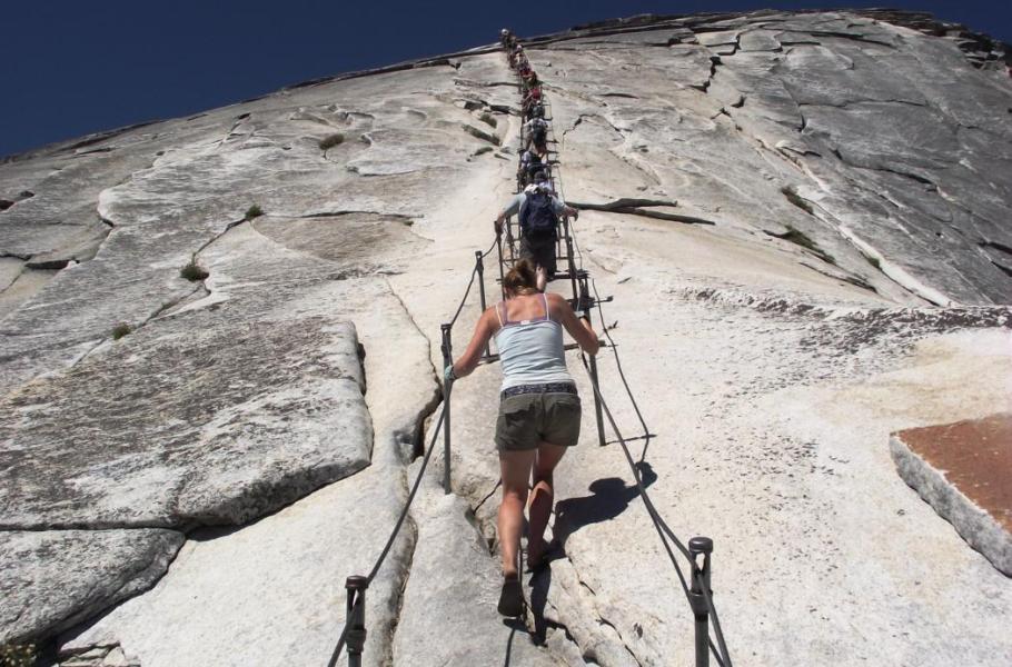 Ani jsme nesnídali, čehož začínám už v polovině cesty, kdy můj žaludek hlasitě protestuje, trpce litovat. Máme podezření, že údaje na mapě jsou trochu podhodnocené. Konečně vyjdeme z lesa a ocitáme se pod Half Dome, kde se jde přímo po skále. Slunce praží a já přestávám vnímat i nádherné výhledy do okolí. Teprve kolem jedenácté hodiny se konečně dostáváme před finální šplhání. Posledních asi 250 metrů se postupuje pomocí kabelů, které tvoří zábradlí úzkého chodníčku, jenž slouží pro cestu tam i zpátky. Je tady slušný frmol, což znamená, že spousta lidí má cestu na Half Dome a dolů naplánovanou jako jednodenní výlet.