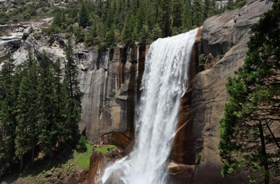 Po sestupu dolů do údolí omrkneme vodopád Bridalveil Fall (Svatební závoj), jehož kapky se rozstřikují všude kolem nás, což je v tomto vedru velmi příjemné. Svlažováni mžením Svatebního závoje znovu obdivujeme místní nádhernou krajinu. Zelené louky jsou lemované žulovými skalisky a vodopády, údolím protéká řeka Merced. Zjišťujeme, že jeden úsek tohoto toku je možné sjet na člunu, a protože máme vlastní plavidlo, je plán na zítřejší den jasný! Teď ale dál po vlastních. Balíme se a hurá vzhůru do našeho dnešního tábořiště. Je to pořád do kopce, a čím se šplháme výš, tím míň lidí potkáváme. Cestou míjíme dva nádherné vodopády – Vernal Falls a Nevada Falls. Zvlášť ten první je určitě jeden z nejkrásnějších, co jsem kdy viděla.
