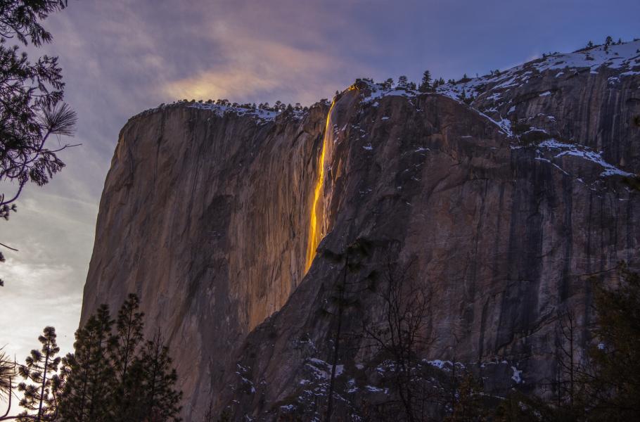 Kolem poloviny února je vodopád během západu slunce nasvícen takovým způsobem, že vypadá jako rozžhavená láva nebo pramínek ohně.