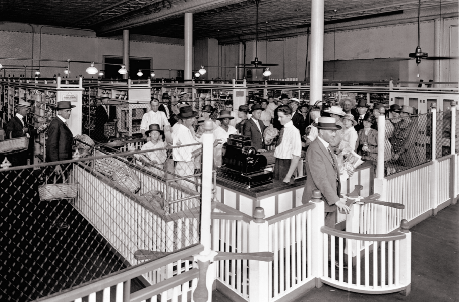 Snímek první samoobsluhy Piggly Wiggly z roku 1918. (foto: Wikimedia Commons, PDM 1.0)