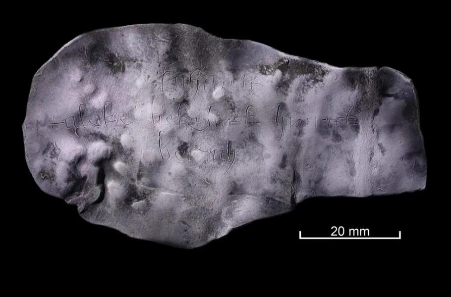 Archeologové na dně latríny narazili na nenápadně vyhlížející kousek stočeného kovu. Nejdřív si mysleli, že jde o nějakou část odpadu. Když ale nález prozkoumali blíž, zjistili, že jde o olověný plíšek z 15. století, na němž je vyrytý nápis vyvedený v gotickém písmu. Po přeložení nápisu se ukázalo, že jde o středověkou kletbu.