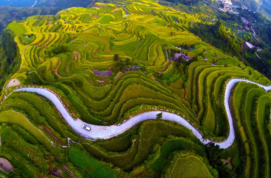 Terasovitá políčka v prefektuře Čou-šan (provincie Če-ťiang) patří k vyhledávaným cílům fotografů. Když ovšem fotoaparát vybavíte speciálním širokoúhlým objektivem a vydáte se fotit z výšky, je výsledek ještě o něco zajímavější.