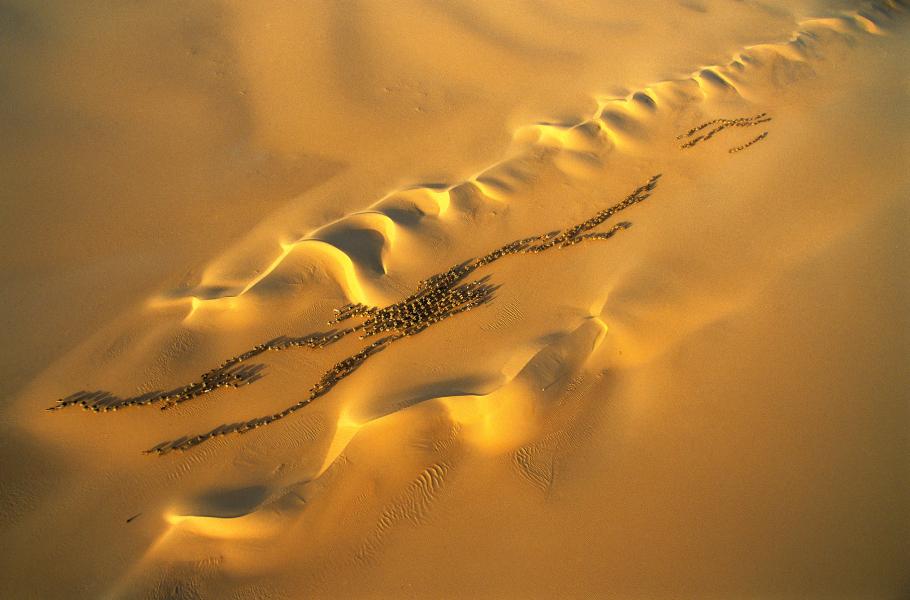Mravenci na pískovišti? Ve skutečnosti karavana velbloudů, která převáží pytle se solí v nigerské poušti Ténéré. Jejich cílem je oáza Bilma, ve které sůl nakupují místní Tuaregové. Každý velbloud nese přibližně 200 kg soli a na zpáteční cestě jen o něco menší množství zásob a proviantu.